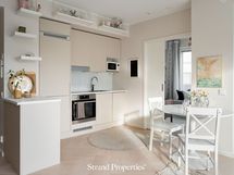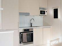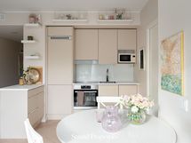 - Avokeittiö yhtenäistä tilaa ruokailutin ja olohuoneen kanssa. Vaalean beigen sävyiset kaapinovet, valkoinen laminaattitaso, maitolasi välitilassa. Varustelu: integroitu jää- pakastinkaappi, kalusteuuni, induktioliesi, liesituuletin ja kapea integroitu astianpesukone. Lattiat kalanruotolaminaattia.