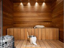- Kuvaus: Seinät ja katto puupaneelia, lauteet lämpökäsiteltyä haapaa ja lattia laattaa. Sähkökiuas.
