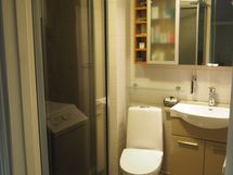 - Pienehkön kylpyhuoneen lattiat ja seinät ovat putkiremontin jäljiltä harmaata laattaa. Kylpyhuoneen varustus: harmaa suihkukaappi, pyyhekuivain, allas + allaskaappi, valaistu peilikaappi + kapeampi seinäkaappi + hyllykkö, WC-pytty, kapea korkea kaappi, lasihylly, pesukoneliitäntä, saippuannostelija, pyyhekoukkuja, WC-paperiteline, paikka pyykinpesukoneelle.
