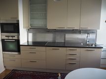 - Keittiön kaapisto mitoitettu tarkkaan seinän tilaan sopivaksi. Kaapeissa runsaasti säilytystilaa. Kivitaso, mustanharmaata graniittia. Kalusteisiin asennetut koneet Mielen: mikroaaltouuni, kalusteuuni (pyrolyysitoiminto), keraaminen liesitaso, liesituuletin (säädin ei täysin toimiva), astianpesukone. Uuni uuden veroinen, astianpesukone uusittu marraskuu 2019. Mielen jääkaappipakastin vapaasti seisova, rosteri, korkeus 198 cm, kompressori uusittu tammikuu 2014. Roskien lajittelun astiat uuden veroiset. Mikrouunia, keraamista liettä, liesituuletinta ja pesuallasta käytetty normaalisti. Varusteisiin kuuluu myös reelinkitanko ja pyyhetanko.