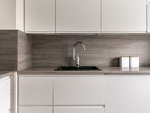 Lattia on laminaattia, seinä maalattua lasikuitutapettia ja työtasot ovat laminaattia.