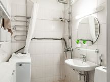 - Pesutilojen kuvaus: Kylpyhuone on kokonaan laatoitettu.