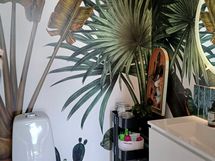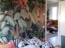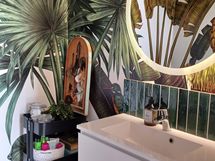 ERILLINEN WC: Seinät Photowall tapetti Find the birds in the jungle, Puustellin allaskaappi, LUMI Pyöreä valopeili. Laatta 45x45 oregon valkoinen. Hana Hansgrohe Focus 70 bideellä. Gustavsberg 1500HF Nautic Duo WC-istuin.