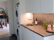 KHH: Kodinhoitohuoneen taso Metal Rock Antrasit 30mm laminaatti ja välitila samasta Metal Rockista Antrasit 12mm. Kaapistot Puustellista. Marazzi lattialaatta 30x60 Powder Graphite. Hana Hansgrohen. Seinät Tikkurilan valkoinen.