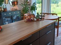Keittiön tasot American Oak 30mm laminaatti, välitila sama Amerikan Oak 12mm. Vetimet Edge -200 Ve418-64-160 , kylmälaitteissa Milo musta 200. Tapwell EVO 184-keittiöhana. Pergo Village Oak Plank lankkulaminaatti.