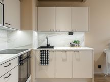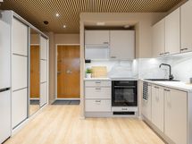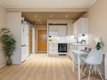 - Induktiotaso, erillisuuni kiertoilmalla, integroitu liesituuletin aktiivihiilisuodattimella, integroitu 3-tasoinen astianpesukone, täyskokoinen no-frost jääkaappipakastin. Kodinkoneilla 7 vuoden takuut (liesituuletin 5 vuotta).