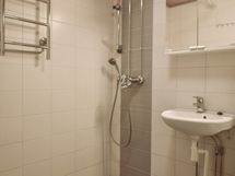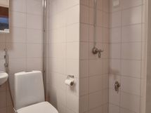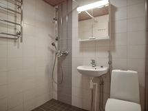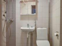 Pesutilojen varusteet: WC-istuin, suihku, suihkuseinä, pesukoneliitäntä, lattialämmitys, peilikaappi, pesuallas, allaskaappi ja bidee-suihku.
