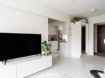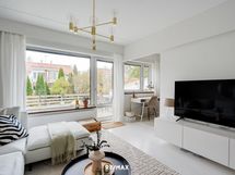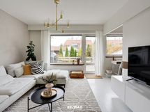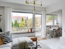 - Ihana valoisa olohuonetila isoilla ikkunoilla, josta käynti jättimäiselle takaterassille. Käynti myös asunnon pienimpään makuuhuoneeseen olohuoneen yhteydessä, näiden väliseinä on kevytrakenteinen ja poistettavissa. Ikkunoissa sälekaihtimet.