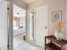- Upea vaatehuone saatesäilytysjärjestelmillä, sekä peili. Tuulikaappi laattalattialla, jossa säilytyskaapisto peiliovilla, sekä eteinen jossa myös säilytyskaapisto peiliovilla.