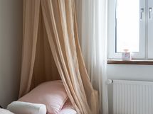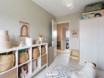 - 1) Alakerrassa pieni makuuhuone/ työhuone, jossa avoin oviaukko olohuoneeseen. 2 ja 3) Yläkerrassa kaksi makuuhuonetta, toinen isompi. Kauniit harmoniset maalisävyt.