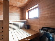 - Kiuas: Sähkökiuas. Iso tilava sauna, jossa ikkuna.