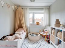 Yläkerrassa sijaitsevat kodin kaksi kunnon kokoista makuuhuonetta, sekä ihana walk-in closet. Yläkerrasta löytyy myös valoisat kylpyhuonetilat isoine saunoineen. Kylppärissä on myös kunnolla säilytystilaa sekä tilaa viikkailuun ja vaatehuoltoon.