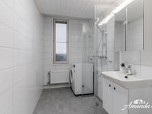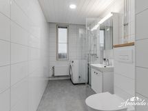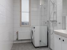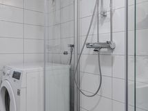 Varustus: Suihku, suihkuseinät, wc-istuin, lavuaari ja pesukoneliitäntä.