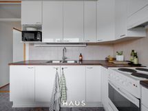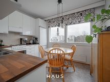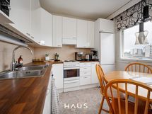 - Keittiön varusteet: Uuni, liesi, liesituuletin ja jääkaappipakastin. Liesi: Valurautaliesi. Työtason materiaali: Laminaatti. Hyväkuntoinen keittiö jossa tilaa ruokapöydälle.