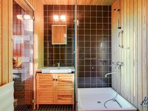 Saunan yhteydessä olevassa kylpyhuoneessa suihku, suihkuseinä, allaskaappi, pesuallas ja peilikaappi.