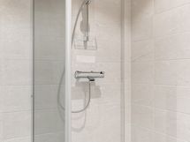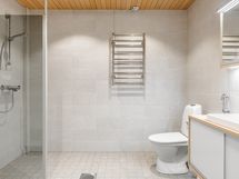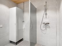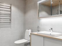 - Suihku, Suihkuseinä, Pesukonevalmius, Peilikaappi, Allaskaappi, Rättipatteri ajastimella, Laattalattia, Halogeenivalot, Laattaseinä, Lattialämmitys,
