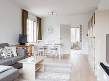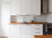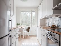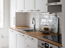 - Liesi: induktio, erillisuuni. Työtasot: puu. Kylmäsäilytys: jääkaappi/pakastin. Varustus: mikroaaltouuni, astianpesukone, kiinteät valaisimet, liesituuletin / suodatin. Keittiö remontoitu 2017