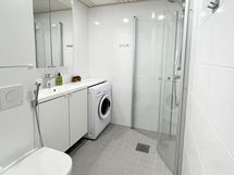 Suihku, Suihkuseinä, Pesukone, Peilikaappi, Allaskaappi, Laattalattia, Halogeenivalot, Lattialämmitys