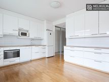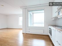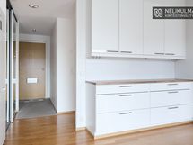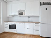 - Keittiön varusteet: Jääkaappipakastin. Liesi: Keraaminen liesi. Työtason materiaali: Laminaatti. Tilava keittiö avautuu olohuoneeseen.