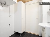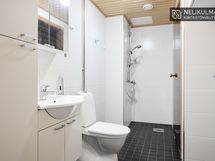 - Pesutilojen varusteet: WC-istuin, suihku, suihkuseinä, pesukoneliitäntä, lattialämmitys, peilikaappi, pesuallas ja bidee-suihku.