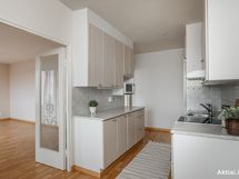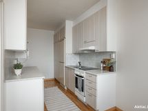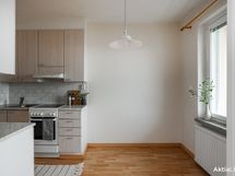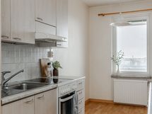 - Jääpakastinkaappi, keraaminen liesi, liesituuletin. Lattia laminaatti, seinät lasikuitutapetti, välitila laatta.