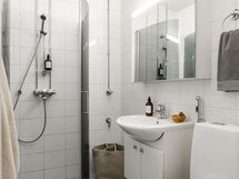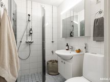 - Pesutilojen kuvaus: Suihku, suihkuseinät, peilikaappi, allaskaappi, wc-istuin, bideesuihku, pesukoneliitäntä. Lattia ja seinät laatta, sähköinen lattialämmitys. Kylpyhuone remontoitu linjasaneerauksen aikana.