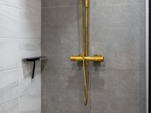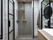 Varustus: suihkuseinä (Lasitehdas), sadetin suihku (Tapwell, messinki), wc-istuin, pesukoneliitäntä, poistovesiliitäntä, allaskaapisto+allas, hana (Tapwell, messinki), peilikaappi, kiinteät valaisimet, pystymallinen pyyhekuivain (sähkö). Valmius asentaa myös vesikiertoinen rättipatteri.