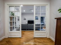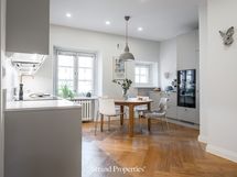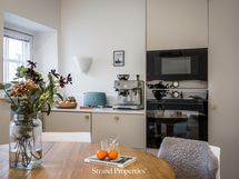 Erillinen tilava keittiö, jossa paikka ruokailuryhmälle kauniiden ruutuikkunoiden äärellä. Boschin laadukkaat integroidut kodinkoneet, vanhat entisöidyt ruokakomerot.