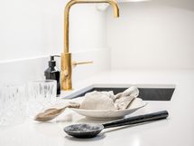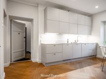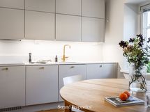 Varusteet: induktioliesitaso, mikroaaltouuni, pakastinkaappi (Electrolux, tason alla oleva pienempi kaappi), jääkaappi, astianpesukone, kalusteuuni, liesituuletin aktiivihiilisuodatin (Savo), kiinteät valaisimet, teräspinnoitettu allas, hana (Tapwell, messinki).