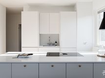 Kitzenin mittatilauskeittiö integroiduilla kodinkoneilla ja saareke (3 m) kvartsitasolla.