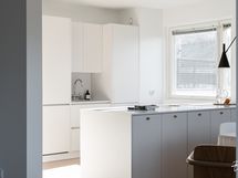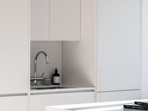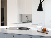 Jää-/pakastinkaappi, uuni (Miele), induktioliesi integroidulla liesituulettimella (Bora) ja astianpesukone. Hana ja allas (Tapwell).