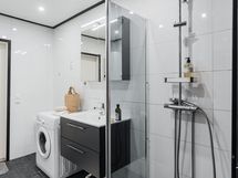 - Pesutilojen kuvaus: Varustus: suihku, suihkuseinä, pesukone, peilikaappi, käsipesuallas, kylpyhuonekaapisto.