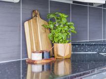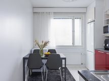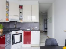 - Kaapistot, jääkaappi/pakastin, uunia ja keraaminen/induktioliesi, liesituuletin, astianpesukone, tasot laminaattia