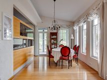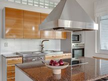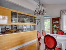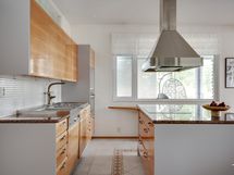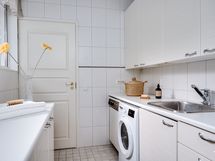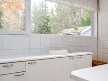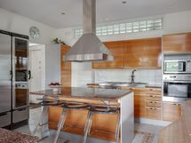 Suuresta avokeittiöstä löytyvät laadukkaat kalusteet Festivon kylmälaitteilla viinikaappeineen. Keittiön takana oleva kodinhoitohuone on tilava ja sitä voi hyödyntää juhlissa helposti vaikka apukeittiönä.
