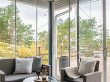 Sisätilat jatkuvat saumattomasti kallioisen tontin päälle rakennetuille terasseille. Terassit lisäävät oleskelutilaa lähes ympäri vuoden, koska valittavana on niin lasitettu terassi kuin suuri avoterassi, jonne mahtuu mukavasti sohvaryhmä ja voit nauttia auringosta koko päivän.
