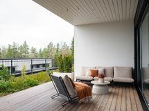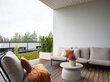 Asumismukavuutta lisää integroitu viilennysjärjestelmä, joka pitää sisälämpötilan miellyttävänä myös kesähelteillä. Olohuoneesta avautuu yhteys etelään suuntautuvalle terassille, jolle aurinko paistaa lähes ympäri vuoden – täydellinen paikka oleskeluun ja auringosta nauttimiseen.
