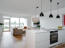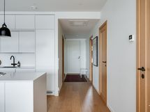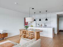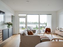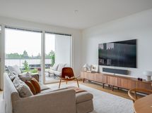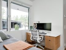 98 m² koti tarjoaa kolme makuuhuonetta ja avaran avokeittiön, joka avautuu olohuoneeseen luoden yhtenäisen ja kutsuvan oleskelutilan. Suuret ikkunat tuovat runsaasti luonnonvaloa ja korostavat kodin avaruutta.
