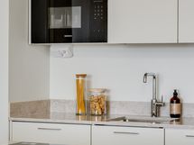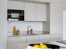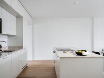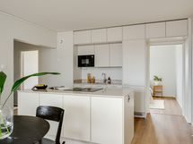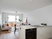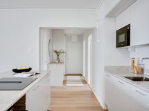 - Laadukas Puuvaja Oy:n toteuttama saarekkeellinen avokeittiökokonaisuus, jonka varustukseen sisältyy: integroitu jääkaappipakastin, induktioliesi, liesituuletin, erillisuuni, kalustemikro, integroitu astianpesukone. Tasot kvartsia (TS Glencoe 20 mm kvartsitaso). Lattia vinyylilankkua.