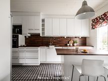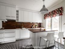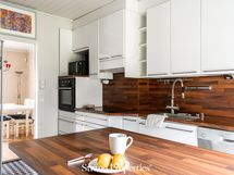 Varustuksena; jääkaappi, pakastin, keraaminen liesi, erillisuuni, liesituuletin (suodatin), astianpesukone, kiinteä valaistus, saareke (irrallinen)
