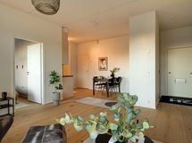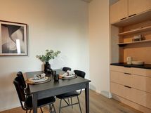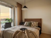 Tässä kodissa jokaisella neliöllä on tarkoitus. Selkeä ja harkittu pohjaratkaisu tarjoaa oman rauhallisen keittiön, tilavan olohuoneen sekä makuuhuoneen, jossa koko seinän mittainen kaapisto tekee arjesta sujuvaa. Lounaaseen avautuva suunta tuo kotiin runsaasti luonnonvaloa koko päivän ajan.