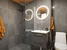 Kylpyhuone on spa-henkinen ja poikkeuksellisen toimiva: oma sauna, pyykkitorni ja hyvin suunniteltu säilytys tekevät kokonaisuudesta käytännöllisen ja viihtyisän.