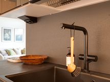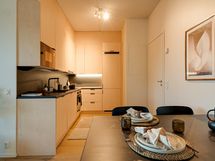 Keittiö on oma kokonaisuutensa – rauhallinen ja käytännöllinen tila, johon mahtuu hyvin ruokapöytä. Aamiaiskaappi viimeistelee kokonaisuuden ja tekee arjen aloituksesta vaivatonta.