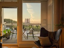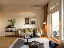 Kodin sydän on valoisa olohuone, joka jatkuu luontevasti 13,5 m² lasitetulle parvekkeelle. Parveke toimii aidosti toisena oleskelutilana keväästä pitkälle syksyyn – pehmeä karvamatto ja ilta-aurinko kruunaavat tunnelman.