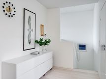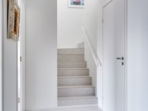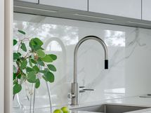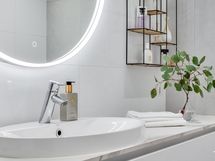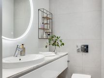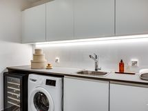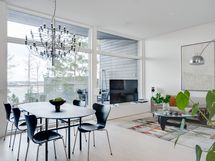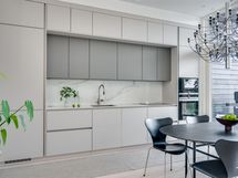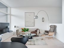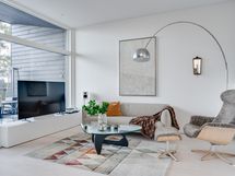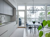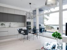 Olohuoneen ja keittiön muodostama yhtenäinen tila on modernin arkkitehtuurin taidonnäyte. Vaaleat pinnat, hillityt sävyt ja korkealaatuiset materiaalit antavat sisustukselle tilaa hengittää.