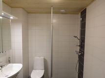 Pesutilojen varusteet: WC-istuin, suihku, suihkuseinä, pesukoneliitäntä, peilikaappi ja allaskaappi.