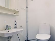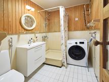 - Pesutilojen varusteet: Suihku, pesukoneliitäntä ja suihkuallas. Pesutilojen kuvaus: pesuhuone seinät osin paneloitu, osin laatta, lattia laatta. Erillisten WC:n lukumäärä: 1. Erillisen WC:n varusteet: WC-istuin, peilikaappi ja bidee-suihku.