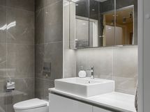 - Pesutilojen varusteet: Suihku, lattialämmitys, wc-istuin, peilikaappi, allaskaappi ja pesuallas. Erillisen WC:n varusteet: WC-istuin, peili, allaskaappi ja bidee-suihku.
