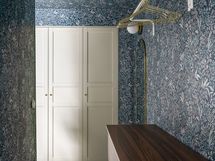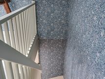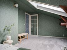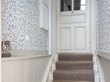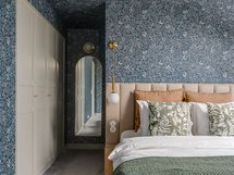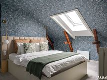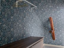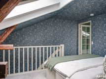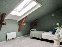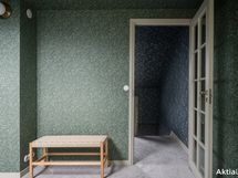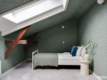 Yläkerrassa yhtenäinen intiimi tunnelma syntyy tapeteista, jotka tuovat syvyyttä ja karismaa makuuhuoneisiin, kun koko huone on kattoa myöten tapetoitu samalla tapetilla. Kokolattiamatto takaa pehmeyttä askeleiden alle ja toimii myös äänieristeenä. Tummat kattoparrut muistuttavat talon historiasta.