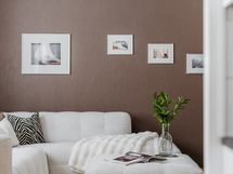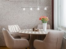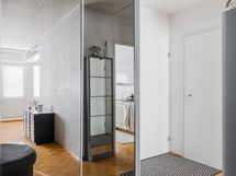 Materiaalit: välitila laattaa, tasot laminaattia, seinät kangastapettia (Poldecor), lattia kalaruotoladottua Saimakoivuparkettia