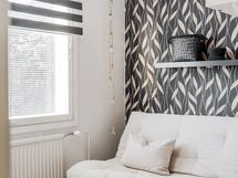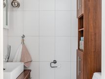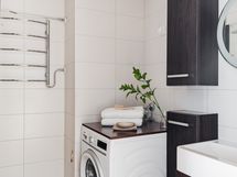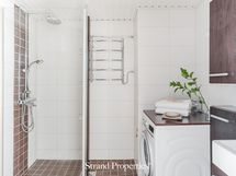 Varustus: sadesuihku, suihkuseinä, allaskaappi, valopeili, kaapistoja, pesukoneliitäntä, pyyhekuivain, lattialämmitys